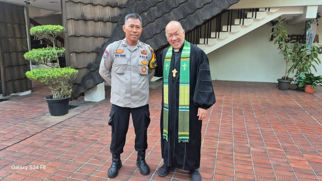 Jakarta – Bhabinkamtibmas Polsek Kebayoran Lama, Bripka Abu Ammar, melaksanakan kegiatan pengamanan ibadah Minggu Kasih di salah satu gereja yang berada di wilayah Kebayoran Lama, Jakarta Selatan, pada Minggu (22/3/2026).